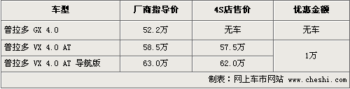 普拉多是一款大尺寸的SUV,皮實的外觀和超強的越野性能一直備受消費者的歡迎,但是普拉多產(chǎn)量并不多,市場上現(xiàn)車的數(shù)量非常少,同時各經(jīng)銷商引入的車型也有相應(yīng)差別。根據(jù)網(wǎng)上車市價格監(jiān)測系統(tǒng)顯示,目前普拉多只有4.0排量車型有部分現(xiàn)車,數(shù)量有限,車源比較緊張,具體行情如下: