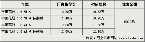 國(guó)產(chǎn)花冠已經(jīng)是其第九代產(chǎn)品,尤其值得稱(chēng)道的是其VVT-i發(fā)動(dòng)機(jī),這是豐田國(guó)產(chǎn)車(chē)型中首款采用此發(fā)動(dòng)機(jī)的車(chē)型。國(guó)產(chǎn)后這款車(chē)的表現(xiàn)依然如日中天,成為一汽豐田的看家產(chǎn)品。根據(jù)網(wǎng)上車(chē)市價(jià)格監(jiān)測(cè)系統(tǒng)顯示,目前花冠全系車(chē)型出現(xiàn)了5000元的優(yōu)惠幅度,具體車(chē)型以及優(yōu)惠如下: