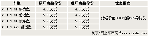 據(jù)奇瑞汽車(chē)4S店銷(xiāo)售人員介紹,奇瑞09款A(yù)1目前只有舒適型有現(xiàn)車(chē)銷(xiāo)售,原廠商指導(dǎo)價(jià)為5.38萬(wàn)元,官方降價(jià)后為4.98萬(wàn)元。A1 1.3L豪華型和新增加的實(shí)力型和自動(dòng)擋目前都沒(méi)有現(xiàn)車(chē),預(yù)訂需要等1-2周才能提到現(xiàn)車(chē)。目前購(gòu)買(mǎi)奇瑞A1全系車(chē)型,都可以贈(zèng)送一款價(jià)值3000元的GPS導(dǎo)航儀一部。