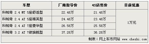 據(jù)雪佛蘭4S店銷售人員介紹:目前2.4升排量車型現(xiàn)車較為充足,顏色較齊全,白色、銀色現(xiàn)車很多,但無紅色車型,如預(yù)定需要等待1-2周時間。3.2車型依舊無現(xiàn)車,訂車需等一個月時間。科帕奇全系目前可優(yōu)惠1萬元現(xiàn)金,不送任何裝飾。