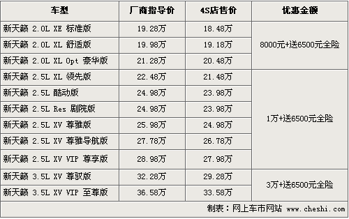 據(jù)4S店銷售人員介紹,目前新天籟全系車型可以贈(zèng)送價(jià)值6500元左右的全險(xiǎn),其中還有現(xiàn)金優(yōu)惠。2.0車型現(xiàn)金優(yōu)惠8000元,2.5車型優(yōu)惠1萬元,而3.5車型則優(yōu)惠到了3萬元,累計(jì)優(yōu)惠幅度最高為3.65萬元。目前全系車型有黑色、紫色等可供消費(fèi)者選擇。