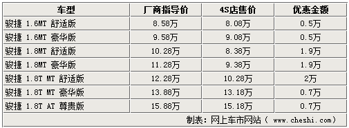 據(jù)4S店銷售人員介紹,駿捷全系車型已經(jīng)分為1.6L、1.8L、1.8T三個排量,目前1.6L車型在商家給出4800元優(yōu)惠后,舒適版和豪華版車型售價分別降到了8.10萬元和9.10萬元。1.8L車型優(yōu)惠1.7萬元,經(jīng)優(yōu)惠后舒適版和豪華版車型售價分別降到了8.78萬元和9.78萬元。1.8T的舒適版車型經(jīng)全系最高的2萬元優(yōu)惠后,售價降到了10.78萬元,跌破了11萬元。
