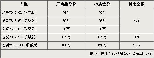 途銳是大眾首款引進(jìn)我國的SUV車型,在3.6L及4.2L率先上市后,大眾為了滿足消費(fèi)者的更大胃口,緊接著又推出了搭載12缸發(fā)動(dòng)機(jī)的6.0L車型。隨著大排量消費(fèi)稅的頒布,給9月份后入關(guān)的大排量車型帶來了一次不小的沖擊,令大排量汽車價(jià)格都上調(diào)了不少,大眾途銳6.0L頂級(jí)版也從原來158萬元的價(jià)格上調(diào)至了180元。近日據(jù)網(wǎng)上車市價(jià)格系統(tǒng)監(jiān)測(cè)顯示,大眾途銳全系的最高優(yōu)惠達(dá)到了10萬元,具體詳情請(qǐng)看下表: