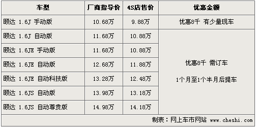據(jù)東風(fēng)日產(chǎn)4s店銷(xiāo)售人員介紹,目前頤達(dá)全系車(chē)型現(xiàn)金優(yōu)惠8千元。經(jīng)優(yōu)惠后,入門(mén)級(jí)的1.6J 手動(dòng)版車(chē)型售價(jià)從10.68萬(wàn)元下降到了9.88萬(wàn)元,高配的1.6JS 自動(dòng)尊貴型售價(jià)也下降到了14.18萬(wàn)元。北京地區(qū)4S店目前只有個(gè)別1.6J時(shí)尚版車(chē)型,其他款車(chē)型無(wú)現(xiàn)車(chē),欲購(gòu)買(mǎi)者需交1000元訂金約等1個(gè)月至1個(gè)半月的時(shí)間。北京地區(qū)各4S店由于訂單不同,各店銷(xiāo)售的現(xiàn)車(chē)顏色有所不同。