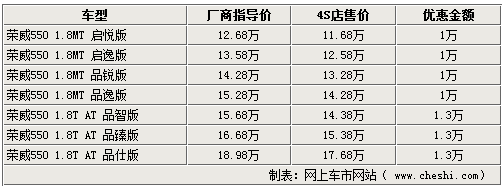 據(jù)銷售人員表示,目前購買1.8T榮威550車型全系可以優(yōu)惠1.3萬元,并加贈超值的保養(yǎng)及裝飾,同時,各店1.8L的榮威550車型也相當充裕,顏色齊全,購車用戶可享受最高1萬元的優(yōu)惠。其他4S店也基本維持在這個優(yōu)惠基礎之上進行銷售,不論是1.8T還是1.8L車型均可滿足消費者的購車挑選需要。