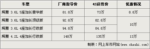 據(jù)北京進(jìn)口大眾經(jīng)銷店銷售人員介紹,目前輝騰3.6L 5座加長豪華版有8.8萬元的現(xiàn)金優(yōu)惠,經(jīng)優(yōu)惠后3.6L 5座加長豪華版的售價(jià)降到了73萬元,跌破了75萬元。排量稍大的4.2L 4座加長行政版有13萬元的優(yōu)惠,經(jīng)優(yōu)惠后售價(jià)從148萬元下降到了135萬元。銷售人員還介紹,4.2L輝騰沒有現(xiàn)車,欲購買的消費(fèi)者需交訂金10萬元預(yù)訂。