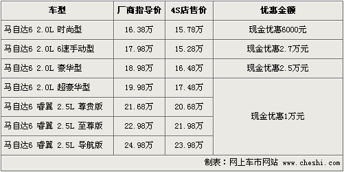 全新馬自達(dá)6睿翼在4月份正式上市,在繼承了馬自達(dá)6老款車風(fēng)格同時,睿翼在外觀和內(nèi)飾上帶給消費者耳目一新的感覺。與此同時,老款的馬自達(dá)6與睿翼同時銷售,兩款車的價位區(qū)間覆蓋從17萬-25萬,為消費者購車提供了較大的選擇空間。根據(jù)網(wǎng)上車市價格監(jiān)測系統(tǒng)顯示,目前睿翼全系優(yōu)惠幅度加大,老款馬6最高優(yōu)惠2.7萬元。具體行情如下: