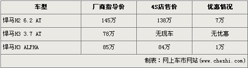 據(jù)北京悍馬經(jīng)銷(xiāo)店銷(xiāo)售人員介紹,目前市場(chǎng)上在售的悍馬分為H2 6.2L和H3 3.7L以及H3 5.3L ALPHA 三款車(chē)型。近期購(gòu)買(mǎi)悍馬H2 6.2L車(chē)型的消費(fèi)者可以得到7萬(wàn)元的優(yōu)惠,經(jīng)優(yōu)惠后售價(jià)降到了138萬(wàn)元。H3 3.7L店內(nèi)沒(méi)有現(xiàn)車(chē),所以沒(méi)有任何優(yōu)惠。H3 ALPHA經(jīng)1萬(wàn)元優(yōu)惠后,售價(jià)從85萬(wàn)元下降到了84萬(wàn)元。