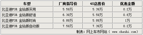比亞迪F3R在推出金鉆版系列車型之后,受到很多消費者的關注與喜愛。金鉆版比亞迪F3R車型增加到了3款,全系售價區(qū)間為5.59萬元-7.59萬元。網(wǎng)上車市網(wǎng)站了解到,近日比亞迪F3R時尚型最高可優(yōu)惠10000元,其他車型也可優(yōu)惠2000到8000元不等。詳情如下: