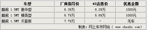 酷熊作為長城汽車在市場上推出的第三款轎車產(chǎn)品,憑借極具個性的造型和寬大的內(nèi)部空間,使很多消費(fèi)者都對其非常感興趣。新車價格分別為豪華型6.39萬元、精英型6.79萬元,天窗版7.79萬元。近日,網(wǎng)上車市網(wǎng)站了解到,長城汽車4S店處的天窗版酷熊仍然是有價無車的狀態(tài),其他兩款車型有現(xiàn)車銷售,可以給出千元的優(yōu)惠。具體詳情如下: