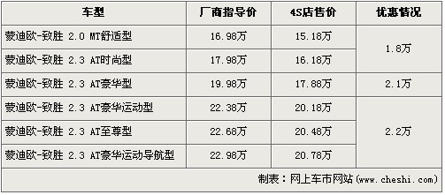 福特蒙迪歐-致勝出自福特最新開發(fā)的EUCD技術(shù)平臺,它采用了沃爾沃S80底盤技術(shù)。在歐洲,蒙迪歐致勝與皇冠成為競爭對手,是一款定位高于雅閣、凱美瑞之流的轎車。近日據(jù)網(wǎng)上車市價(jià)格系統(tǒng)檢測顯示,蒙迪歐-致勝全系最高優(yōu)惠2.2萬元,具體車型價(jià)格詳情請看下表: