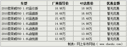 2010款榮威550上市后,隨著廠家產(chǎn)能的逐步提升,各家4S店的貨源問題早已得到解決。據(jù)網(wǎng)上車市網(wǎng)站了解,目前北京地區(qū)的榮威4S店里的550全系現(xiàn)車比較充裕,暫時沒有現(xiàn)金優(yōu)惠,而老款車型各店已經(jīng)基本售空。具體詳情如下: