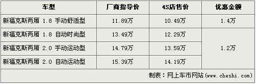 ?怂箲{借出色的外觀設(shè)計(jì)及極佳的操控性贏得了市場(chǎng)的認(rèn)可,在銷(xiāo)量方面一直保持迅猛的勢(shì)頭。尤其新款福克斯的上市,一改內(nèi)飾略顯粗糙的詬病,使得?怂垢呌谕昝馈8?怂共捎昧宋譅栁諷40底盤(pán),將操控進(jìn)行到底,這一優(yōu)勢(shì)博得全世界的掌聲,名副其實(shí)成為了這個(gè)級(jí)別的標(biāo)桿車(chē)型。據(jù)網(wǎng)上車(chē)市價(jià)格系統(tǒng)檢測(cè)顯示,目前兩廂?怂谷底罡邇(yōu)惠1.4萬(wàn)元,具體車(chē)型價(jià)格請(qǐng)看下表: