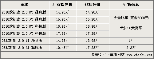 據(jù)東風雪鐵龍銷售人員介紹,2010款凱旋目前沒有任何優(yōu)惠,車型顏色也不太齊全,預訂訂金為5000元,最快20天可提車。另外08款凱旋還有少量現(xiàn)車低價甩貨,最高優(yōu)惠幅度為2.2萬元左右,顏色以黑色、銀色為主。北京地區(qū)各4S店由于訂單不同,各店銷售的現(xiàn)車顏色有所不同。