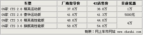 據(jù)4S店銷售人員介紹:目前在售的凱迪拉克09款CTS共有2.8L和3.6L兩個排量車型。這4款車型中,3.6升車型優(yōu)惠幅度較大,2款車可優(yōu)惠4萬元;而2.8升車型優(yōu)惠較少,豪華運動版僅優(yōu)惠5000元。目前3.6升車型為數(shù)不多,喜歡的朋友請盡快與店內(nèi)聯(lián)系。顏色方面,2.8升精英運動版車型有白色、銀色、金色,2.8升豪華運動版有紅色車型,3.6升車型有紅色、灰色車型。另外,年底或明年初將上市新款凱迪拉克CTS,并配備3.0升直噴發(fā)動機,對此車感興趣的朋友請隨時關注。