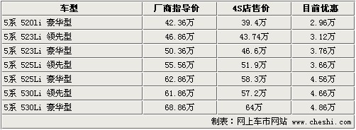 據(jù)4S店銷售人員介紹:目前寶馬5系最高優(yōu)惠4.86萬元,部分車型有現(xiàn)車。520Li領(lǐng)先型由于銷量不好,所以暫時停產(chǎn),目前2.0排量車型只有520Li豪華型。523Li系列車型只有523Li豪華型有現(xiàn)車,但顏色不全只有銀色黑內(nèi)飾車款,如預(yù)定523Li領(lǐng)先型需等1-2個月時間。525Li系列豪華型有現(xiàn)車,顏色為銀色、白色及灰色,525Li領(lǐng)先型車款預(yù)訂需等1個月時間。530Li領(lǐng)先型有金色、銀色現(xiàn)車,530Li豪華型有灰色現(xiàn)車。目前最高優(yōu)惠可達(dá)4.86萬元,優(yōu)惠幅度較大。
