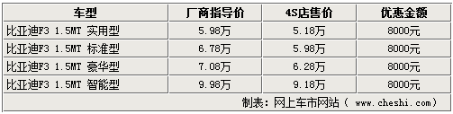 作為比亞迪汽車旗下的重點(diǎn)產(chǎn)品,比亞迪F3在今年又推出了智能白金版,新款車型增加了無鑰匙系統(tǒng)、智能娛樂通訊系統(tǒng)等高端配置,使這款自主品牌家用轎車的競爭力更加突出。網(wǎng)上車市網(wǎng)站了解到,雖然比亞迪F3智能白金版上市時(shí)間不長,但目前優(yōu)惠幅度有所提升,經(jīng)銷商處全系可給出8千的優(yōu)惠。詳情如下: