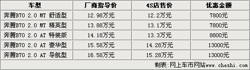 據(jù)一汽奔騰汽車4S店銷售人員介紹,目前09款奔騰B70現(xiàn)車顏色不全,主要以銀色車型為主,目前手動擋車型只能優(yōu)惠7800元;上市不久的自動特裝版能夠優(yōu)惠8800元;而另外兩款自動擋車型現(xiàn)在能夠優(yōu)惠到13000元,如果到店詳談還能有更多的優(yōu)惠政策。2010款奔騰于九月十六日正式推出,售價(jià)在12.98萬至18.88萬元之間,現(xiàn)在店內(nèi)現(xiàn)車比較充足,但是沒有任何現(xiàn)金方面的優(yōu)惠,商家在購車時(shí)贈送車輛保險(xiǎn)。