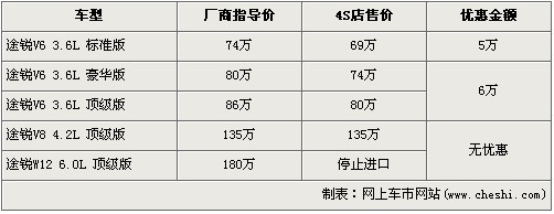 途銳是大眾首款引進(jìn)我國(guó)的SUV車(chē)型,在3.6L及4.2L率先上市后,大眾為了滿足消費(fèi)者的更大胃口,緊接著又推出了搭載12缸發(fā)動(dòng)機(jī)的6.0L車(chē)型。隨著大排量消費(fèi)稅的頒布,給9月份后入關(guān)的大排量車(chē)型帶來(lái)了一次不小的沖擊,令大排量汽車(chē)價(jià)格都上調(diào)了不少。近日據(jù)網(wǎng)上車(chē)市價(jià)格系統(tǒng)監(jiān)測(cè)顯示,大眾途銳的6.0L車(chē)型已經(jīng)停止進(jìn)口,并且購(gòu)買(mǎi)目前購(gòu)車(chē)可以得到最高6萬(wàn)元的優(yōu)惠,具體詳情請(qǐng)看下表: