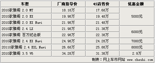 雅閣一直是中級(jí)車(chē)市場(chǎng)最受矚目的車(chē)型之一,棱角分明的外觀以及舒適的內(nèi)飾空間以及豪華程度成為眾多商務(wù)人士最佳選擇。廣州本田在推出2010款車(chē)型后,使雅閣整車(chē)的性?xún)r(jià)比進(jìn)一步提升。據(jù)網(wǎng)上車(chē)市價(jià)格監(jiān)測(cè)系統(tǒng)顯示:目前雅閣的優(yōu)惠幅度有所降低,最高優(yōu)惠2.9萬(wàn)元。具體車(chē)型行情如下: