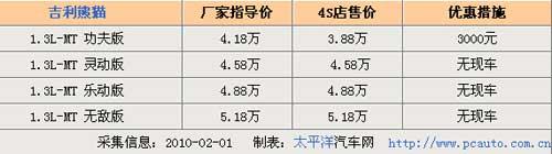 近日,筆者從北京吉利4S店了解到,目前該車的優(yōu)惠幅度比較穩(wěn)定,手動(dòng)擋車型功夫版外均有4000元的現(xiàn)金優(yōu)惠,但現(xiàn)車方面僅有功夫版車型有少量現(xiàn)車,有意向購買的消費(fèi)者可要抓緊了。詳情請(qǐng)見下表: