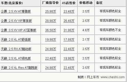 中級豪華車的標桿-------新天籟全系采用了CVT無級變速箱,連續(xù)的動力輸出雖然少了駕駛激情,但順暢的動力輸出帶來了平順的駕乘感受,日產系列發(fā)動機不錯的抑噪能力也是很有群眾口碑的,配合新天籟寬大舒適的座椅,無論是駕駛還是乘坐,都是一種愜意的享受,商用和家用兩者皆可。近日根據(jù)網(wǎng)上車市價格監(jiān)測系統(tǒng)顯示,目前購買天籟最高可以享受到4.7萬元的價格優(yōu)惠,最低售價僅為17.88萬,具體車型售價見下表: