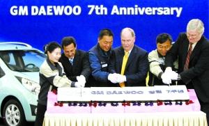 10月15日,韓國仁川,通用大宇慶祝7歲生日。通用汽車首席執(zhí)行官韓德勝(右三)、通用汽車公司執(zhí)行副總裁羅瑞立(右一)與通用大宇領(lǐng)導層切蛋糕。在當日的新聞發(fā)布會上,韓德勝稱,出售歐寶的談判仍在繼續(xù)進行。2001年10月17日,通用汽車與其合作伙伴鈴木汽車及上汽集團,共同收購了大宇汽車66.7%的股份。