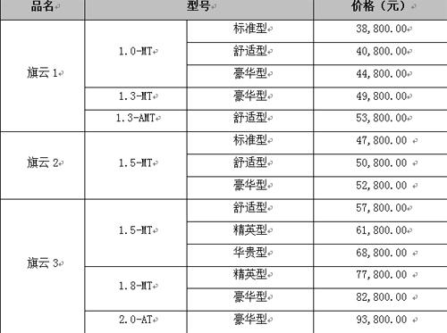 整合后的旗云品牌將面對(duì)大眾消費(fèi)者,以“務(wù)實(shí)、家庭、信賴”為品牌內(nèi)涵,為消費(fèi)者提供可以輕松擁有、值得信賴的汽車產(chǎn)品,現(xiàn)階段主要包括旗云1、旗云2和旗云3三款產(chǎn)品,分別在A0級(jí)、A級(jí)、A+級(jí)三大市場(chǎng)中豎立“空間、節(jié)能、性價(jià)比”新標(biāo)桿。同時(shí)在未來(lái),旗云品牌將進(jìn)一步豐富產(chǎn)品線和品牌內(nèi)涵,從而滿足國(guó)內(nèi)汽車市場(chǎng)差異化的需求。