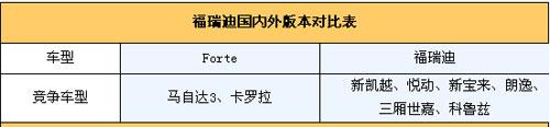 由于二者的定位不同,國內(nèi)外的競(jìng)爭(zhēng)車型也有很大差別,在國外Forte最直接的競(jìng)爭(zhēng)被鎖定為馬自達(dá)3和豐田的卡羅拉,但再國內(nèi),這一情況將有所改變。目前來看,福瑞迪將來最有力的競(jìng)爭(zhēng)者將是新凱越、悅動(dòng)、新寶來、朗逸、三廂世嘉、科魯茲等車型。和卡羅拉、馬自達(dá)3的的競(jìng)爭(zhēng)關(guān)系并不是很明顯。