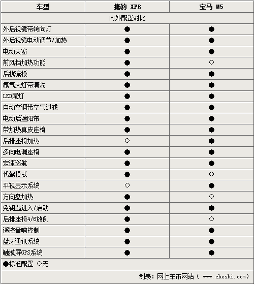 既然提到兩款車均為豪華車型,舒適配置當(dāng)然也是不能被忽視的一面。捷豹XFR則在此方面表現(xiàn)的可圈可點(diǎn),多項(xiàng)高端配置均一一齊備。而價格相差3萬的寶馬M5在此方面則略顯遜色,看來寶馬車型更加在乎駕駛樂趣。但從此方面則證明了捷豹XFR為有機(jī)會乘坐其中的駕乘者想的更多,不僅滿足了駕駛與運(yùn)動的樂趣,也可直接享受更多的舒適及便利。