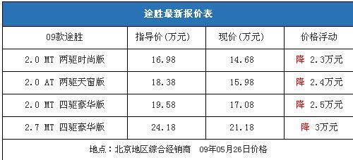 近期國內(nèi)市場SUV車型再次升溫,4月份銷量較上月有大幅增加,其中途勝4月份銷量高達(dá)4050輛,排在SUV銷量榜第四位。我們從北京地區(qū)的一家北京現(xiàn)代綜合經(jīng)銷商處了解到,09款途勝全系車型的優(yōu)惠在2.3-3萬元區(qū)間,價格和三月初基本相同,只有2.7手動四驅(qū)豪華型的價格比月初下降了2000元,優(yōu)惠金額增加到了3萬元。以下是09款途勝最新詳細(xì)報價表: