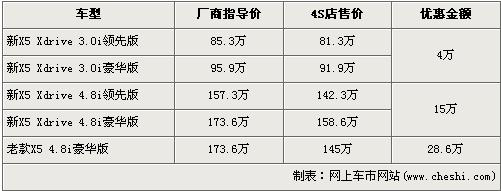 寶馬全新X5于去年7月上市,此車的上市為競爭激烈的高性能運(yùn)動(dòng)型多功能車(SAV)細(xì)分市場再次在操縱靈活性方面制定起新的標(biāo)準(zhǔn)。全新寶馬共有3.0L及4.8L兩個(gè)排量選擇,價(jià)格區(qū)間為83.7萬元-173.6萬元。近日根據(jù)網(wǎng)上車市價(jià)格檢測系統(tǒng)顯示:寶馬X5全系最高優(yōu)惠金額達(dá)28.6萬元,具體詳情請(qǐng)看下表: