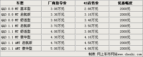 今年年初,奇瑞汽車正式推出了QQ3啟航版,共有三款車型,售價3.38-4.78萬元。奇瑞QQ3啟航版是在原有車型的基礎(chǔ)上增加更多使用配置,而價格方面也與原車型基本保持一致。奇瑞推出的QQ3啟航版使該系列車型在性價比方面進一步提高。據(jù)網(wǎng)上車市網(wǎng)站價格監(jiān)測系統(tǒng)顯示,奇瑞QQ3目前出現(xiàn)了一定的優(yōu)惠幅度。