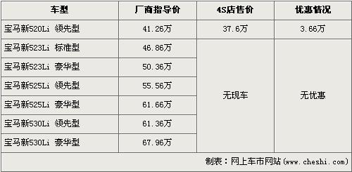據(jù)北京寶馬經(jīng)銷店的銷售人員介紹,目前購買寶馬新520Li領(lǐng)先型可以得到3.66萬元的優(yōu)惠,經(jīng)優(yōu)惠后新520Li領(lǐng)先型的售價(jià)從41.26萬元降到了37.6萬元。銷售人員還介紹,目前店內(nèi)除了520Li領(lǐng)先型有現(xiàn)車外,其它車型均無現(xiàn)車,欲購買的消費(fèi)者需交定金2萬元,約等1個(gè)月后可提車。