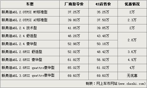 據(jù)4S店銷售人員介紹,目前奧迪A6L全系可以最高優(yōu)惠4.9萬元。奧迪A6L全系分為2.0TFIS,2.4L,2.8FSI,3.0FSI四種共10個(gè)車型,最低配的2.0TFSI標(biāo)準(zhǔn)型經(jīng)2萬元優(yōu)惠后售價(jià)從37.25萬元下降到了35.25萬元,而2.8FSI 豪華版經(jīng)全系最高的4.9萬元優(yōu)惠后售價(jià)也降到了56.92萬元。全系最高配的3.0FSI quattro豪華版目前店內(nèi)沒有現(xiàn)車,欲購買的消費(fèi)者需要交1萬元訂金,約等3個(gè)月后方可提車。