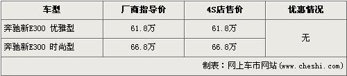 據(jù)北京奔馳4s店銷售人員介紹,奔馳新E級(jí)先期上市的車型為E300優(yōu)雅型和E300時(shí)尚型,售價(jià)分別為61.8萬元和66.8萬元。前期預(yù)訂新E級(jí)的車主已經(jīng)可以到店內(nèi)提車,近期欲購買奔馳新E級(jí)的消費(fèi)者需交1萬元訂金,9月份才可提車。