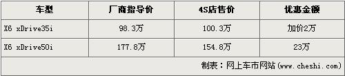 據(jù)北京寶馬經(jīng)銷店銷售人員介紹,現(xiàn)在在售的X6車型分為售98.3萬元的35i車型和售價為177.8萬元的50i兩款車型。目前購買35i車型的消費者沒有優(yōu)惠,提現(xiàn)車還要加價2萬元,售價從98.3萬元上升到了100.3萬元,排量更大的4.4升的50i車型有23萬元的現(xiàn)金優(yōu)惠,售價降到了154.8萬元。銷售人員還介紹,X6車型現(xiàn)車店內(nèi)充足,消費者挑選的空間不小。