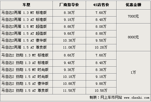 馬自達(dá)2是長(zhǎng)安馬自達(dá)繼3系列之后又一定位更加年輕化的城市小車,Mazda2沿襲馬自達(dá)經(jīng)典的“Zoom-Zoom”設(shè)計(jì)理念,并同時(shí)結(jié)合了優(yōu)異的安全性、舒適性及燃油經(jīng)濟(jì)性表現(xiàn)。根據(jù)網(wǎng)上車市價(jià)格監(jiān)測(cè)系統(tǒng)顯示,目前全系最高可優(yōu)惠現(xiàn)金1萬元左右,具體行情如下: