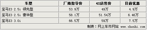 據(jù)4S店銷售人員介紹:目前寶馬X3全系3款車型全部有優(yōu)惠,最高優(yōu)惠7.5萬元。目前X3 2.5i豪華型與3.0i有現(xiàn)車,2.5i豪華型現(xiàn)車顏色有黑色、金色、銀色、灰色、白色,現(xiàn)車比較多顏色較齊全;3.0i車型僅有銀色現(xiàn)車。X3領(lǐng)先型預(yù)定需等到今年底活明年初,如果不著急購買的消費者可以等待。目前購買X3任何一款車型,均可獲得原車導(dǎo)航系統(tǒng)。