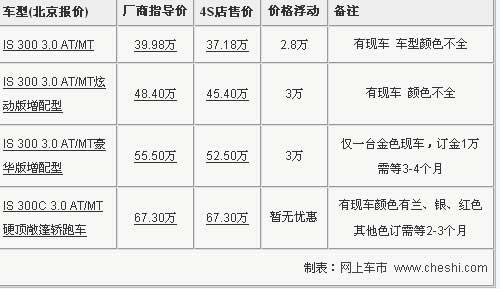 雷克薩斯IS300在原來車型基礎(chǔ)上,新推出了2010款的增配版車型,三款車增加了智能副駕駛系統(tǒng)等重量級(jí)的高端配置,但是售價(jià)并沒有明顯的變化。目前根據(jù)網(wǎng)上車市價(jià)格監(jiān)測(cè)系統(tǒng)顯示,IS300最高可優(yōu)惠現(xiàn)金3萬元,部分現(xiàn)車供應(yīng)。具體行情如下: