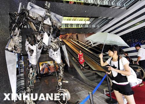 6月23日,觀眾在杭州一家電影院觀看“汽車人”。這個(gè)“汽車人”高逾4米,重達(dá)2噸,由各種廢棄汽車零件焊接組裝而成,是為即將上映的電影《變形金剛2》造勢(shì)特別制作的。新華社發(fā)(李忠 攝)