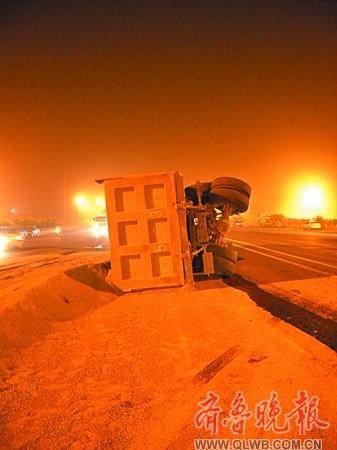 5日晚上8時許,在濟南經(jīng)十東路邢村立交橋東側,一輛滿載沙子的斯太爾大貨車與一輛小轎車相撞,大貨車發(fā)生側翻,沙子撒了一地,汽油從油箱里流了出來,空氣中彌漫著汽油的味道。而小轎車車身嚴重變形,基本報廢。