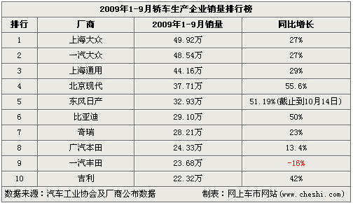 近日,來自汽車工業(yè)協(xié)會的數(shù)據(jù)顯示,今年1-9月,乘用車?yán)塾嬩N量超過720萬輛,比去年全年凈增48.59萬輛,同比增長超過40%,創(chuàng)歷年最高。轎車生產(chǎn)企業(yè)銷量排行前十位的廠商,都獲得了大幅增長當(dāng)然不包括一汽豐田,它比較意外的出現(xiàn)了負(fù)增長,同比下滑了16%,是銷量排行前十位的廠商中唯一下滑的車廠(詳見下表)。