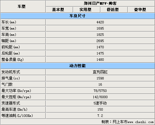 鄭州日產(chǎn)即將投產(chǎn)的帥客分為四款車(chē)型,這四款車(chē)型的長(zhǎng)寬高都分別達(dá)到4420/1695/1825毫米,軸距也達(dá)到了2695毫米,這些數(shù)據(jù)確保了其寬敞的內(nèi)部空間。1470毫米和1475毫米的前后輪距保障了帥客的操控性能。動(dòng)力方面帥客搭載了1.6升直列四缸發(fā)動(dòng)和5速手動(dòng)變速箱,最高時(shí)速可以達(dá)到150公里/小時(shí)。