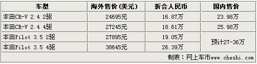 通過同屬本田旗下的SUV車型——CR-V可以看出,這款車型在美國的售價(jià)為2.46萬美元(折合人民幣約為16.87萬),而同款CR-V在國內(nèi)的售價(jià)為23.98萬元,其中間差價(jià)為7萬元左右,所以我們預(yù)計(jì)這款中級(jí)SUV的售價(jià)將在27——36萬左右。