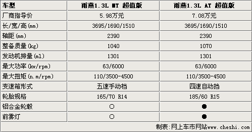 從圖表中可以看到,雨燕的兩款超值版價(jià)格相差1.1萬元,在性能和配置方面都有一些不同之處。首先,雨燕超值版的車身尺寸和軸距都沒有任何變化,但自動擋車型的整備質(zhì)量比手動重30kg。另外,在動力搭配相同的情況下,雨燕1.3L AT超值版匹配四速自動變速箱,所以加速和高速行駛的表現(xiàn)不會超過手動擋車型。不過雨燕1.3L AT 超值型采用了15寸輪胎和鋁合金輪轂,而且還配備了手動擋所沒有的前霧燈,其他配置方面并無差異。
