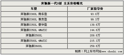 奔馳新一代S級轎車將于今晚在太廟正式上市,首推S300L商務(wù)型、S300L尊貴型、S350L豪華型、S350L 4MATIC、S500L、S500L 4MATIC和S600L共計(jì)7款車型,售價(jià)為93萬元-259.8萬元。而在上海車展全球首發(fā)的奔馳新S400L 混合動力車型,未在本次上市車型中出現(xiàn)。具體車型及售價(jià)如下表所示: