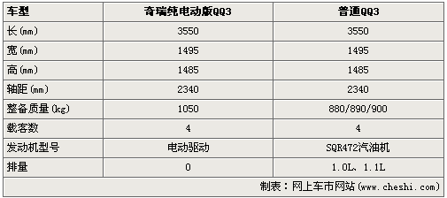 從基本參數(shù)來(lái)看,純電動(dòng)版QQ3與普通版QQ3相比,車身尺寸沒(méi)有變化,不過(guò)在車重上增加了不少,這可以看出電動(dòng)模塊還是比較重的,當(dāng)然比較特別的電動(dòng)QQ3絕對(duì)零排放,不過(guò)對(duì)于電動(dòng)模塊的參數(shù)暫時(shí)還沒(méi)有,有待進(jìn)一步的消息發(fā)布。