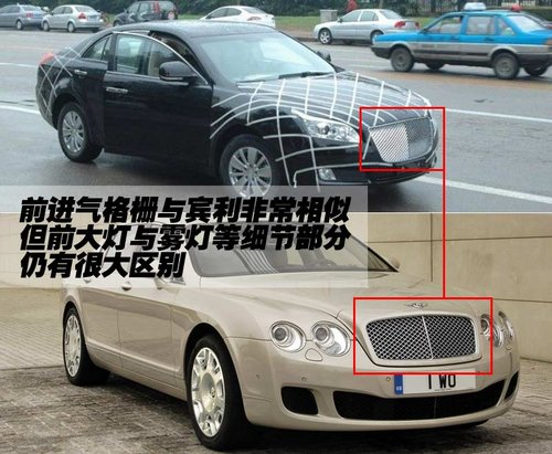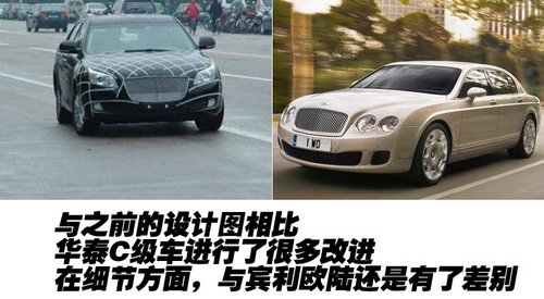 華泰B級車的車身尺寸足以媲美賓利歐陸飛馳,而且整車的側(cè)面腰線也非常流暢,但與賓利前后線條下墜的樣式還是有不同之處。而且尾部的造型雖然摻雜了一些模仿的元素,但尾燈、霧燈包括輪轂等設(shè)計都全然不同。