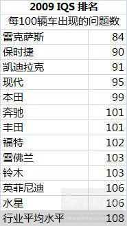 JD Power的2009年研究,訪談超過(guò)了80900名買(mǎi)家,關(guān)于他們頭三個(gè)月的使用情況,共提問(wèn)228個(gè)問(wèn)題,這項(xiàng)研究從2月進(jìn)行到5月。這項(xiàng)研究共包括了37個(gè)品牌,基于2009款車(chē)型,統(tǒng)計(jì)在頭90天內(nèi)被車(chē)主發(fā)現(xiàn)的質(zhì)量問(wèn)題。
